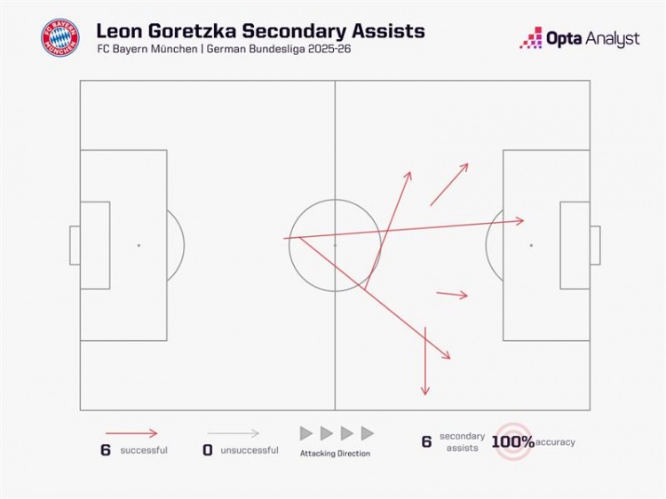 Opta指出,本赛季德甲联赛,格雷茨卡送出6次进球之前的倒数第二传,所有德甲球员之中最多。