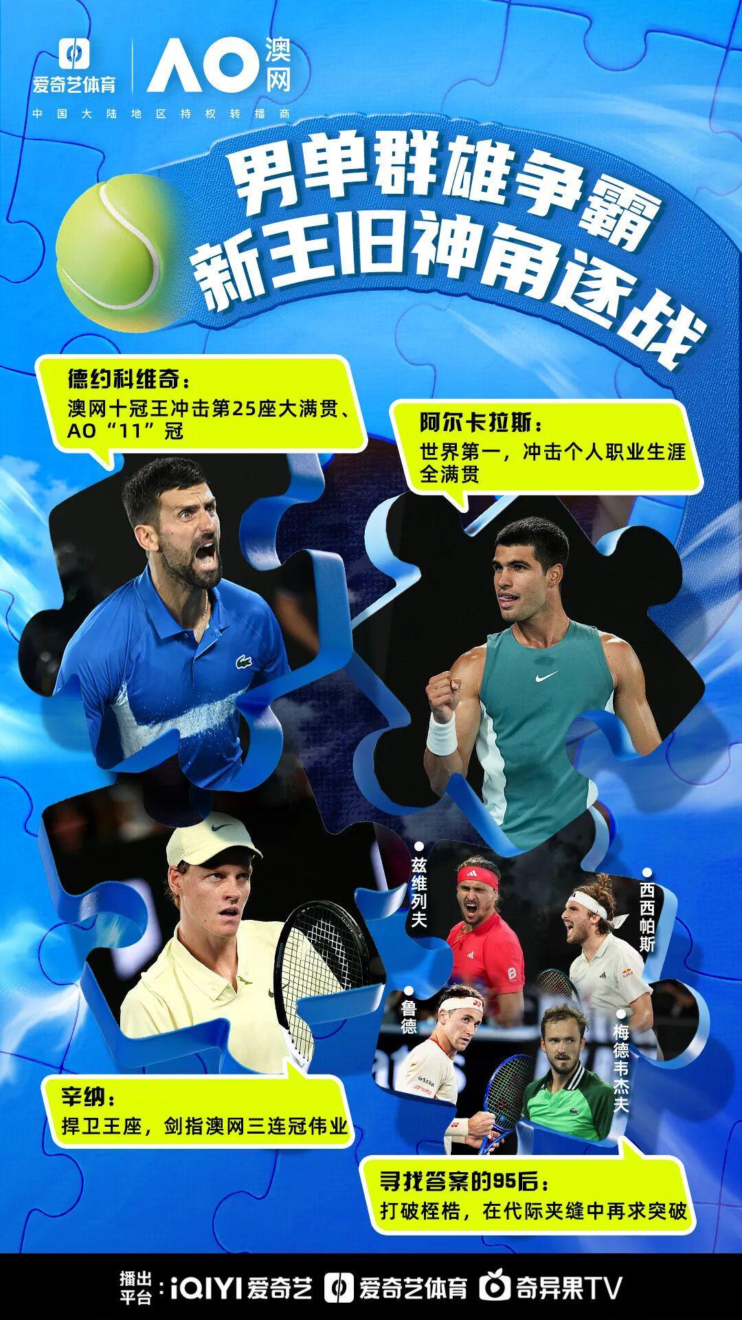 王欣瑜、张之臻领衔中国军团8人征战单打,男网“F4”首次集结携手冲佳绩!新绝代双骄辛纳、阿尔卡拉斯能否延续对大满贯决赛的无情垄断?德约能否收复失地冲击大满贯25冠?萨巴伦卡、斯瓦泰克、高芙、莱巴金娜开启争冠四天后模式?兹维列夫、阿利亚西姆、弗里茨、阿尼西莫娃、佩古拉、凯斯对男女单至高荣耀虎视眈眈!盛夏的墨尔本公园即将上演一出精彩无限高潮迭起的网坛开年大戏!爱奇艺体育在此为您梳理看点,请注意查收。